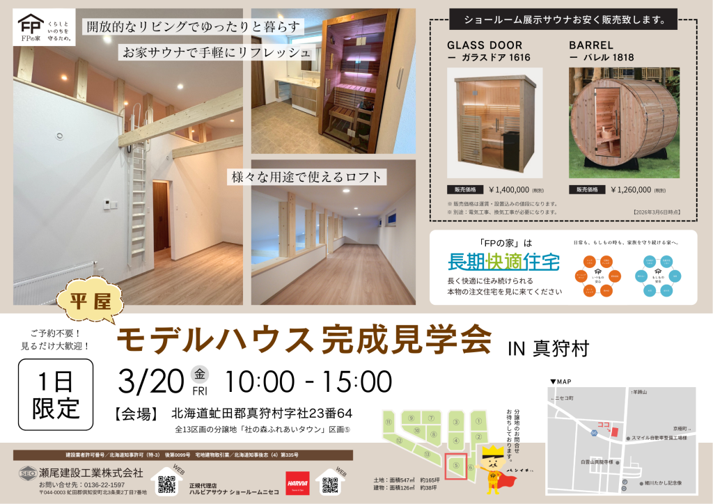 1日限定、モデルハウス完成見学会を開催いたします。ロフト、サウナ、デッキ付平屋住宅。